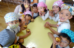 年長さんが力を合わせてお菓子作りに挑戦です。おいしくできました!